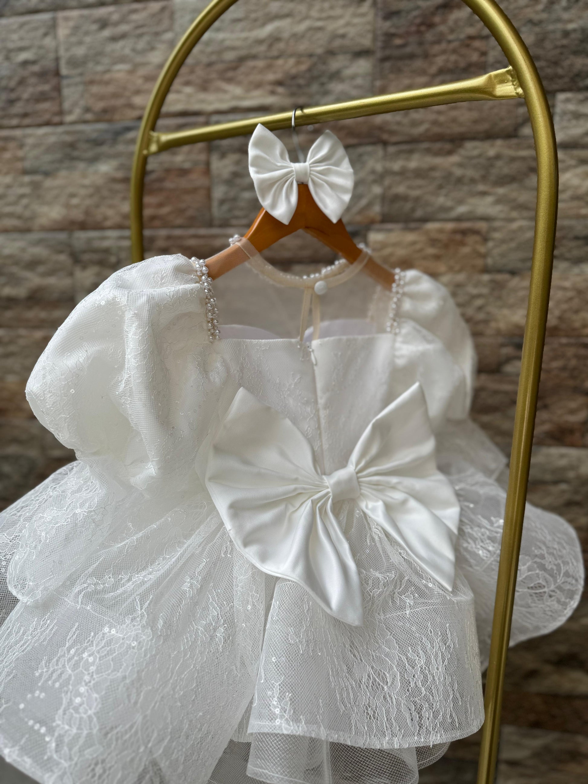 Abito sartoriale incluso di fiocco per la testa e scarpe da culla.